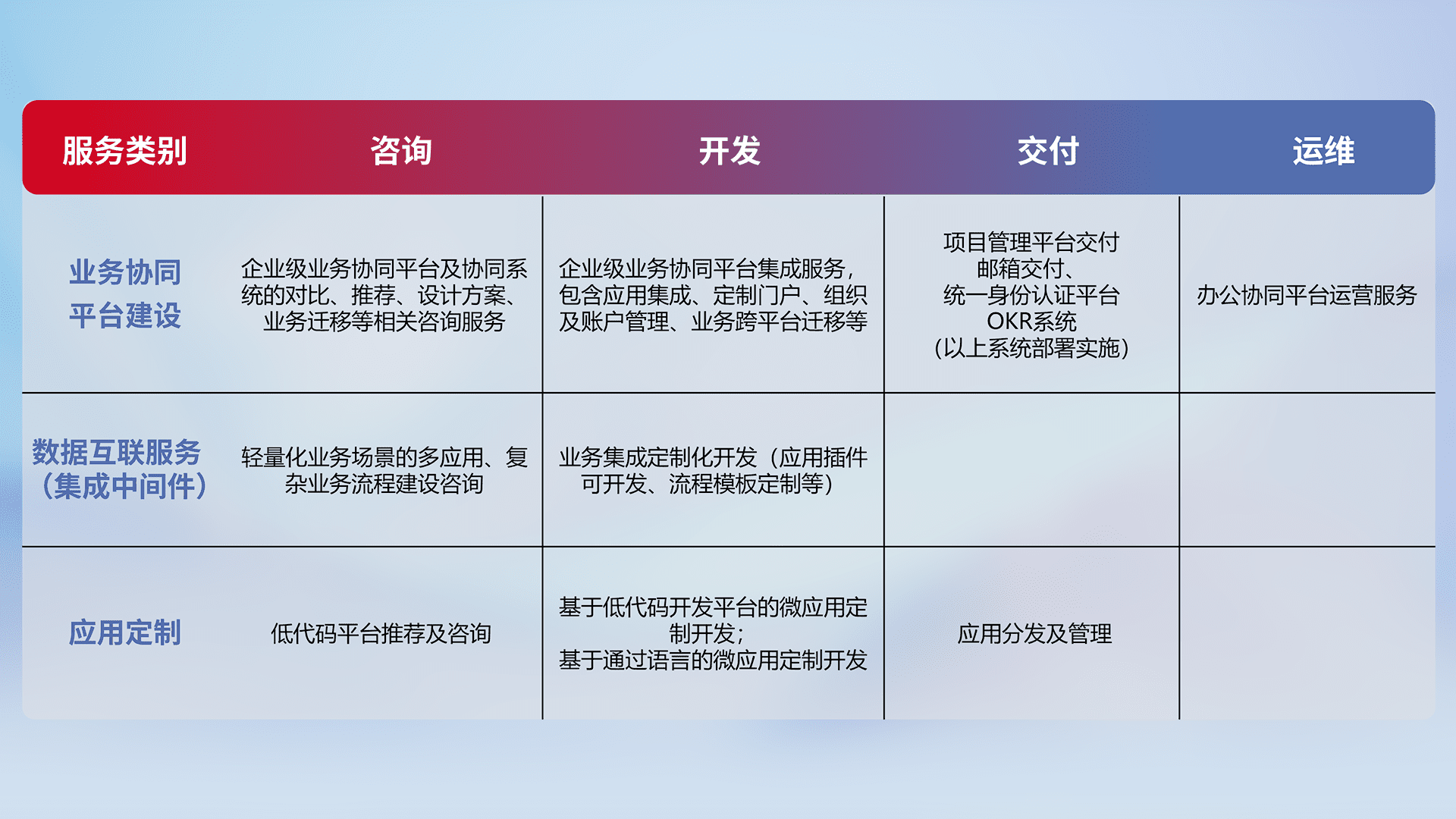针对钉钉、、企微、、IDaas等平台级产品提供产品的规划、、、、方案、、交付、、、定制化开发等服务,,,实现如统一协同办公、、、、智能客户服务、、混合会议管理、、、、智能数据查询、、等业务场景,,,,实现数字化转型。。