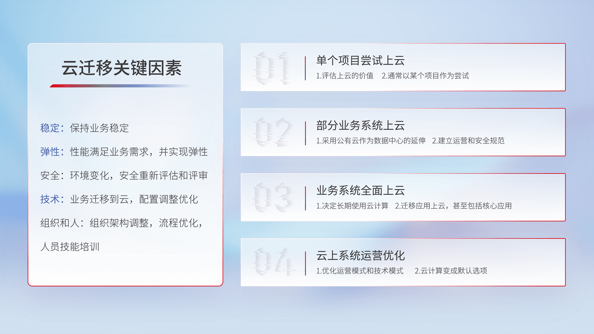 结合实际业务,,,,从规划设计、、、云平台选型、、、云原生改造、、、、数据迁移、、、、集成交付,,,,迁移全过程为客户识别最佳上云路径,,,,做好风险识别管理,,设计网络架构、、身份权限、、安全审计合规、、、操作审计、、日志审计、、监控告警策略、、、多站点容灾设计等,,对云上基础设施进行整体规划,,,提升IT治理水平,,,以满足弹性、、高可用、、、高性能的需求。。。。
