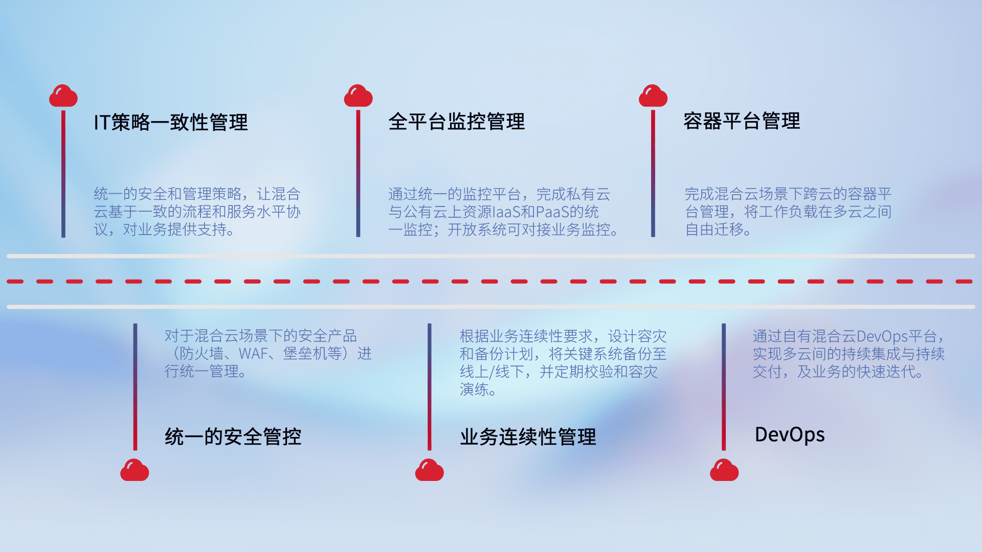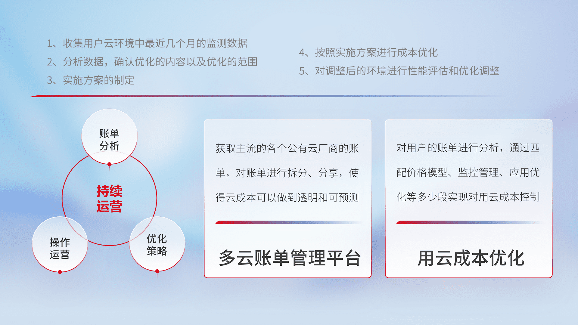 通过多云纳管,,以统一的资源数据模型把客户的云资源进行抽象和封装,,进而实现对多云资源的统一操作,,,保障云资源管理的可靠性、、、、稳定性与可用性。。。。量身定制化运维内容,,配置、、开发运维、、、补丁管理、、、备份、、监控、、认证和访问管理、、、审计和日常巡检等,,,,保障在用云过程中的可靠度,,稳定度以及高可用率。。。。